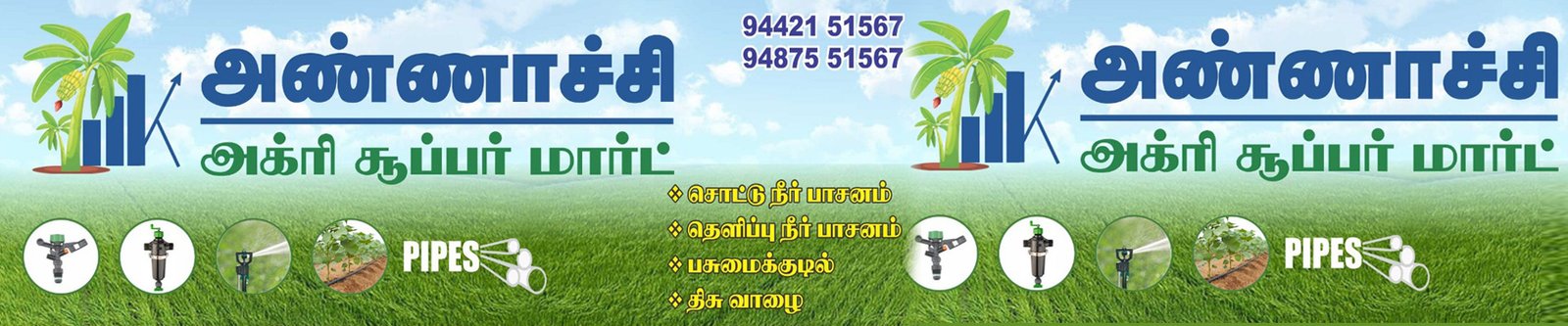 Annachi Agri Super Mart, விவசாயத்திற்குத் தேவையான உபகரணங்கள் மற்றும் சாதனங்கள் ( Agriculture Machinery & Garden Tools ) உற்பத்தி செய்யும் முன்னணி நிறுவனங்களான KissanKraft மற்றும் KSNM Marketing போன்ற நிறுவனங்களின் தயாரிப்புகளை விற்பனை செய்யும் அங்கீகாரம் பெற்ற நிறுவனம் ஆகும்.